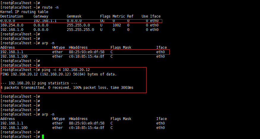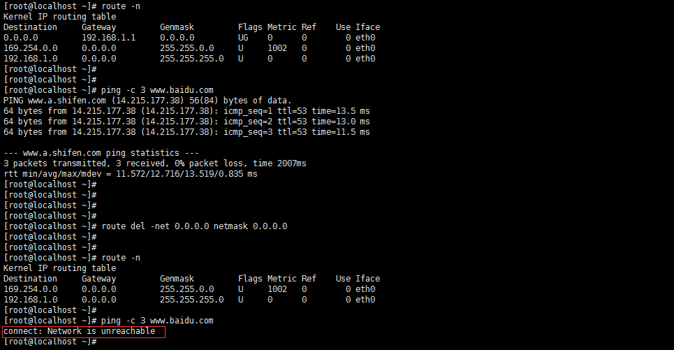 例如,删除默认路由,然后ping不存在主机网络的主机地址。